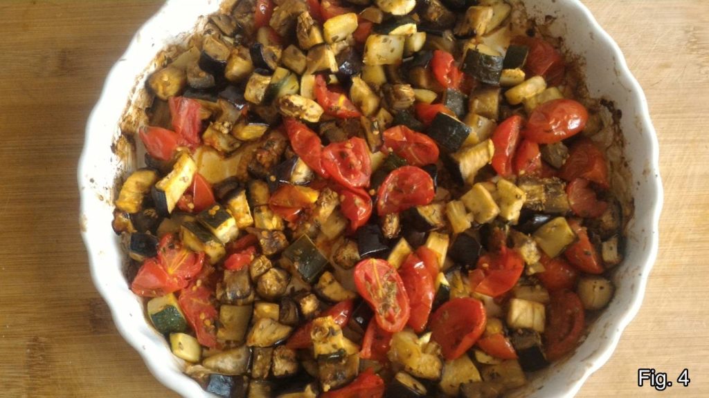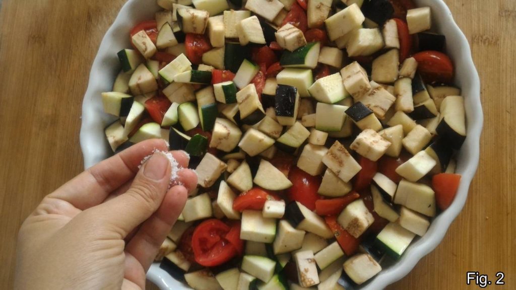 Depois de lavar e limpar os vegetais, corte as berinjelas e a abobrinha em cubos e os tomatinhos ao meio ou em quartos se forem particularmente grandes (fig. 1).