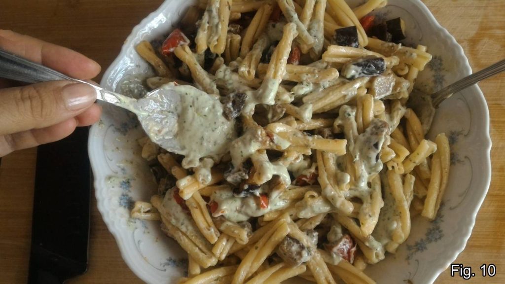 Apenas pouco antes de servir, adicione o creme de manjericão e misture (fig. 10).