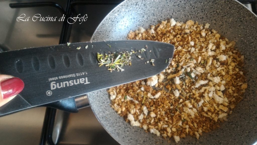 Comece preparando a muddica atturrata, tostando-a até ficar levemente dourada em fogo baixo em uma panelinha junto com o alecrim picado com a faca e 2 colheres de azeite. Desligue e reserve.