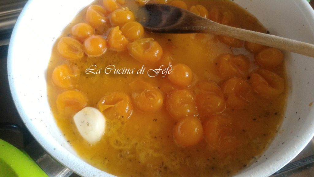 Em uma segunda panela maior, doure por alguns minutos o dente de alho com um fio de azeite e 2 colheres de chá de farofa de alcaparras, então adicione seus tomatinhos com todo o seu suco mantendo o fogo alto por mais alguns minutos.