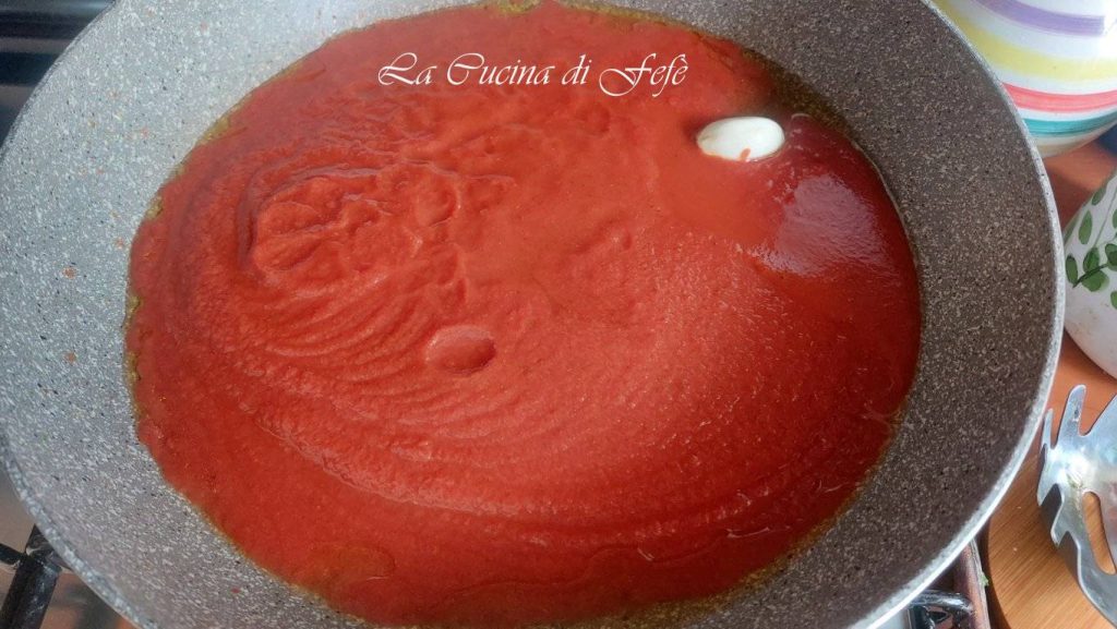 Adicione a passata de tomate, feche com uma tampa e deixe cozinhar por 10′ em fogo baixo.