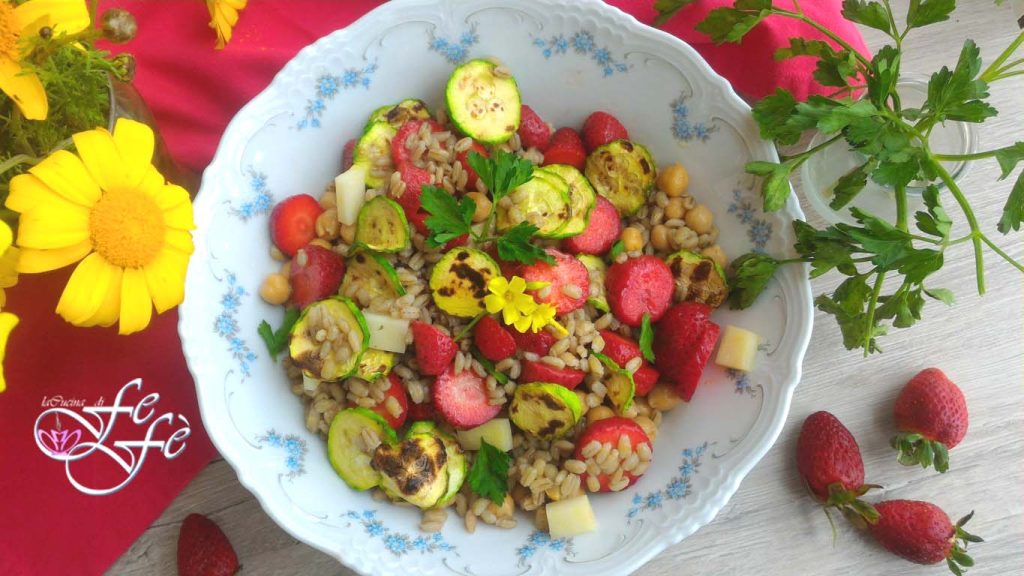 A salada de cevada perlada com grão-de-bico, abobrinhas e morangos nasceu um pouco por acaso, assim como muitas das minhas receitas anti-desperdício e de reaproveitamento! A regra básica é não comprar em excesso para evitar que os alimentos cheguem à data de validade sem terem sido consumidos. Se isso, porém, acabar acontecendo, tentados por preços competitivos e vantajosos, basta reaproveitar o excedente e utilizá-lo em outras receitas! E foi exatamente o caso aqui: uma caixa de morangos super vantajosa que corria o risco de não ser consumida a tempo. Eu não tinha vontade de fazer o típico doce de morango; em vez disso, a ideia de preparar um primeiro prato vegetariano com cara de primavera, fresco e delicado, mas sobretudo rico em proteínas, vitaminas e sais minerais, me interessou. Os morangos oferecem uma agradável doçura ao paladar, ligeiramente atenuada pelo sabor mais marcante da provola del Casale, uma especialidade que vocês poderão substituir por uma provola doce ou picante, conforme preferirem. Enfim, um prato incomum com um sabor surpreendente que, prometo, não vai desapontar!