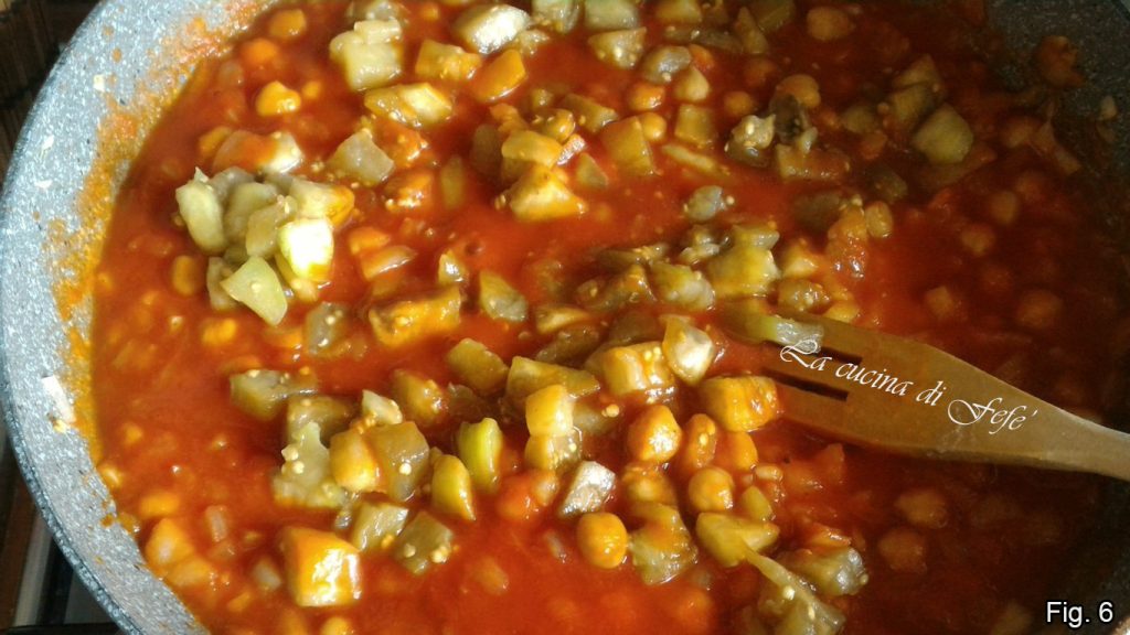 Neste ponto, adicione as berinjelas estufadas, sal, pimenta, feche a tampa e deixe cozinhar em fogo baixo por cerca de 20′.