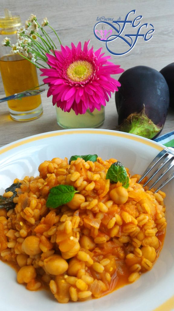 Cozinhe a cevada perolada em uma panela com bastante água salgada por cerca de 30′. Enquanto isso, lave a berinjela, descasque-a, retire o pedúnculo e corte em pedaços. Refogue-a em um wok com um fio de azeite, um dente de alho e um pouco de água por 10′ com a tampa fechada até ficar macia.