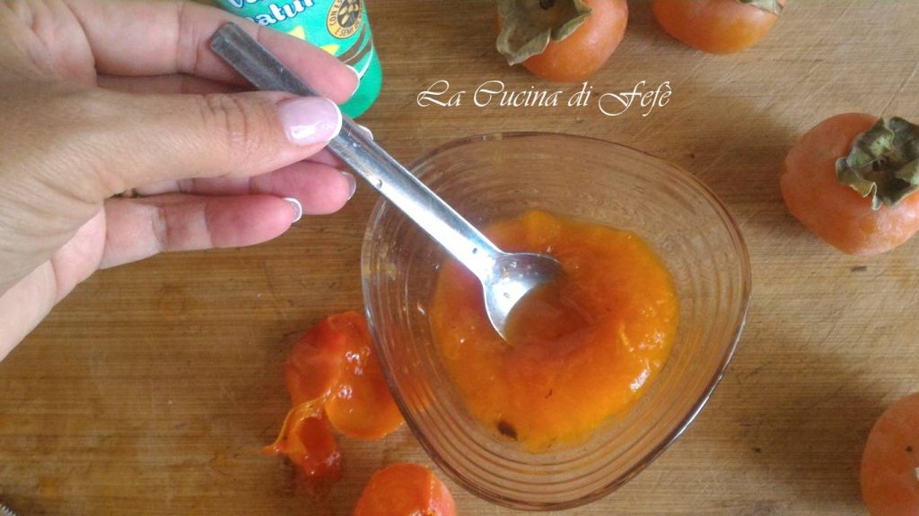 Com a ajuda de uma colher, obtenha 70 gramas de polpa de caqui e trabalhe-a em uma tigela até obter uma consistência cremosa.