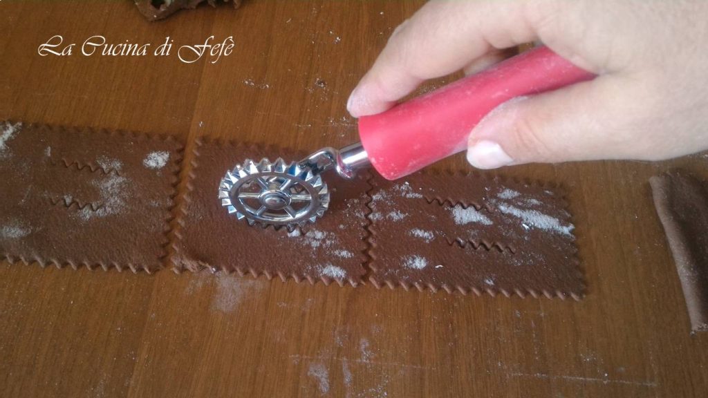 Faça um corte central em cada um deles e disponha os retângulos afastados para que não grudem, em tábuas ou pratos levemente enfarinhados. Proceda dessa forma até terminar a massa.