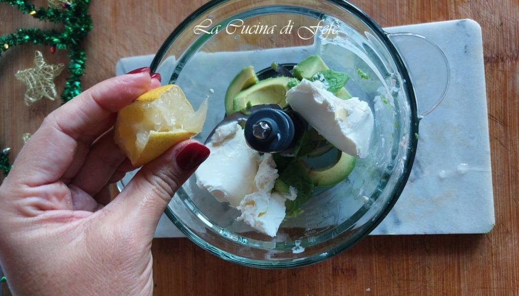 Reduza o abacate em cubos e transfira para o copo de um liquidificador junto com o queijo cremoso e algumas gotas de limão.