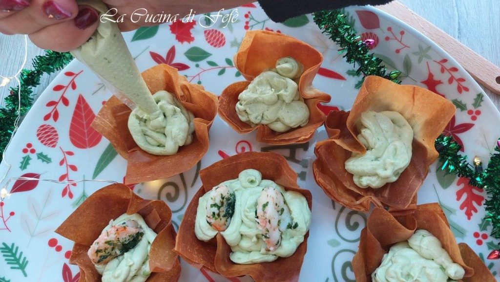 🟣Em vez de camarões: Para pessoas que têm alergia alimentar a camarões, e, portanto, a crustáceos (lagosta, caranguejo, lagostim, etc.), é possível enriquecer as cialdas de massa filo com esturjão ou salmão defumado ou pedaços de tamboril refogados na frigideira por 3′-4′ de cada lado, até que fiquem dourados e a carne fique macia e suculenta. Se quiser preparar uma versão vegetariana, pode substituir o peixe por tomates secos em conserva ou decorar com uma simples farofa de pistache.