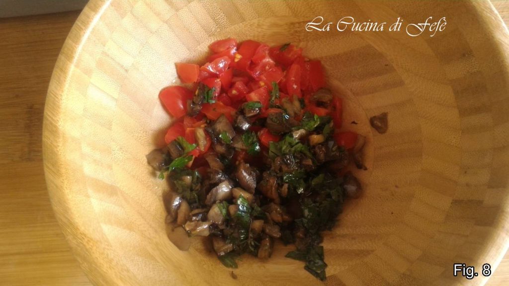 Proceda assim com os cogumelos restantes. Em uma tigela, corte os caules em pedaços (fig. 4). Lave os tomatinhos em água corrente e corte-os em cubos, em seguida, seque-os com papel de cozinha para absorver toda a sua água (fig. 5).