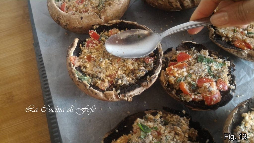 Recheie-as com o composto preparado anteriormente, pressionando com uma colher e temperando com mais um fio de óleo (fig. 13)