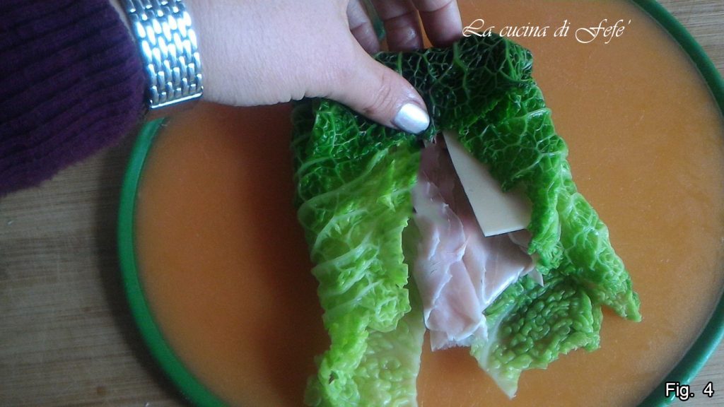 • Dobre as folhas de repolho primeiro lateralmente e depois pelo centro, então enrole até obter quase rolinhos, mas menos espessos e mais largos (fig. 4).