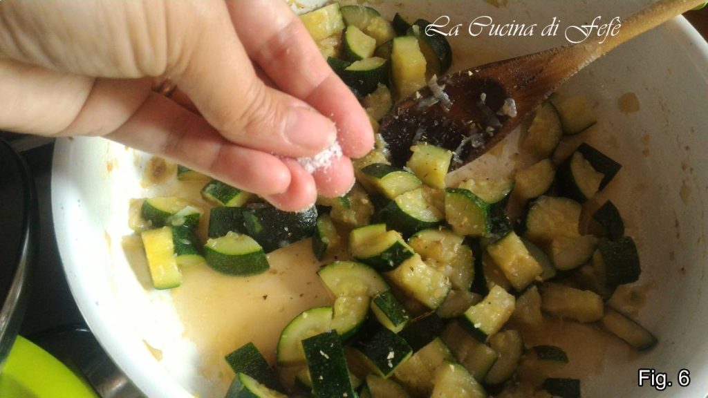 Em uma frigideira grande, doure a cebolinha por alguns minutos com duas colheres de óleo e 50 ml de água (fig. 4). Em seguida, adicione as abobrinhas, deixe refogar por mais um minuto, abaixe o fogo para o mínimo e tampe (fig. 5).