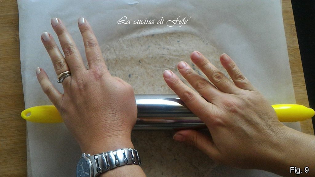 • Após esse tempo, abra a massa entre duas folhas de papel manteiga, ajudando-se com um rolo de massa até obter uma folha fina de cerca de 2 mm (fig. 9).