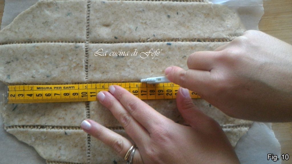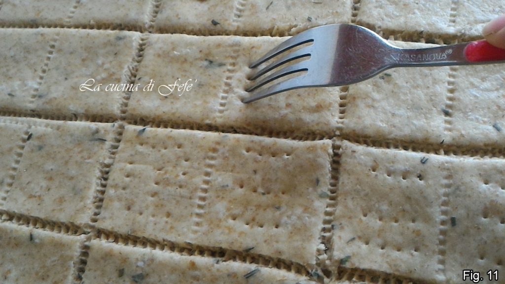 • No meio de cada retângulo, faça uma incisão sempre com o cortador de massa, depois faça furos na superfície com os dentes de um garfo (fig. 11).