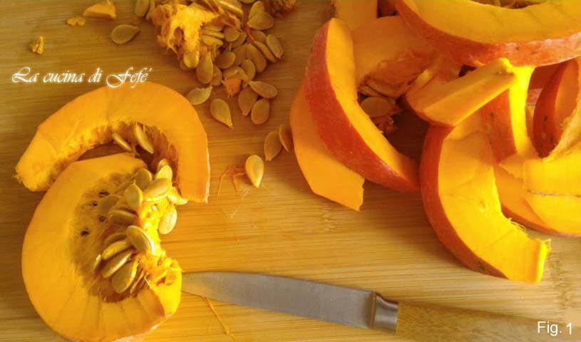 Comece limpando a abóbora, removendo a casca externa, as sementes e os filamentos internos, depois corte em fatias não muito grossas (fig. 1).