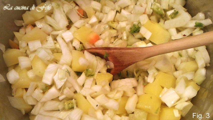 Numa grande panela, doure o azeite com a cebola por alguns minutos. Misture e adicione as batatas cortadas, adicionando 2-3 colheres de caldo de legumes (fig. 2).