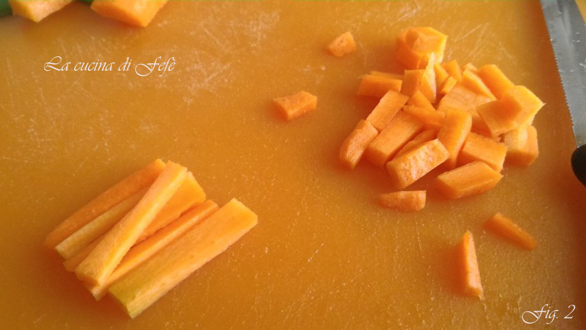 • Enquanto isso, lave as cenouras, descasque-as e prepare uma brunoise, ou seja, um corte em cubinhos bem pequenos (fig. 2).