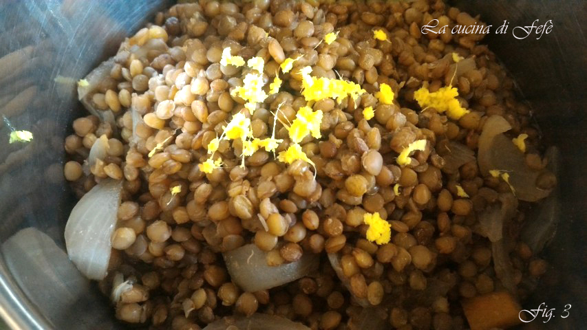 • Uma vez cozidas as lentilhas, elimine as folhas de louro e o zimbro; tempere com sal e escorra quase todo o caldo, cuidando de reservar um pouco dele. Aromatize com o gengibre fresco ralado e uma pitada de pimenta branca (fig. 3).