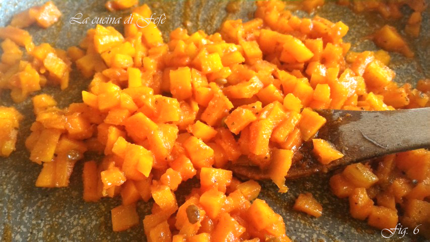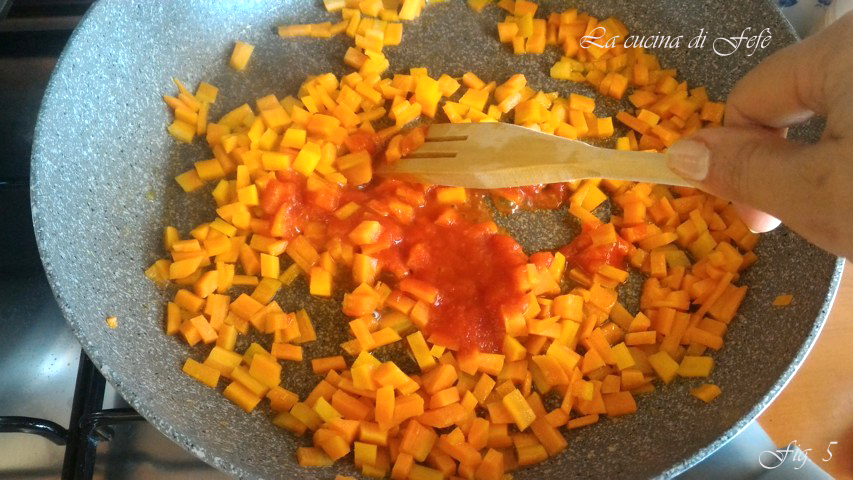 • Adicione então o molho de tomate aos poucos, alternando com algumas outras colheres de caldo de lentilhas, conforme necessário, e cozinhe por cerca de 15′ em fogo moderado (fig. 5).