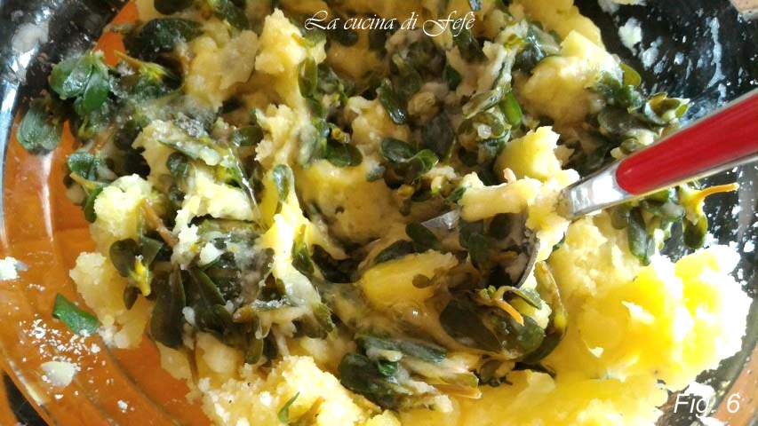 Adicione o ovo, o queijo parmesão ralado, uma pitada de sal e pimenta, e finalmente a beldroega bem escorrida, então misture bem (fig. 6).