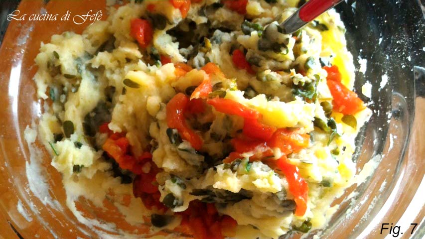 Adicione o pimentão previamente assado, descascado e cortado em tiras finas e pequenas, e continue misturando bem todos os ingredientes (fig. 7).