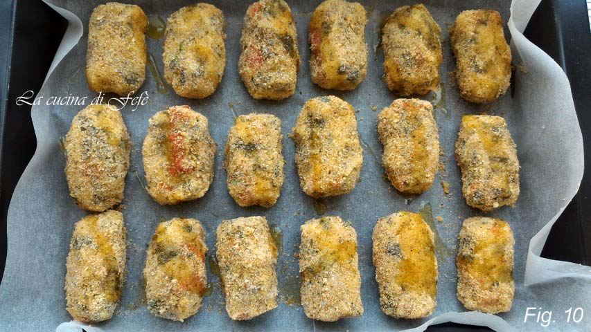 Disponha assim os croquetes em uma assadeira forrada com papel manteiga e regue a superfície com um fio de azeite (fig. 10).