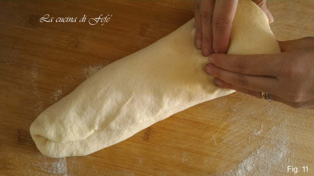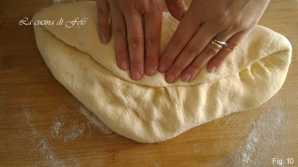 Em seguida, transfira para a superfície de trabalho ligeiramente enfarinhada e estenda com as mãos (fig. 9).
