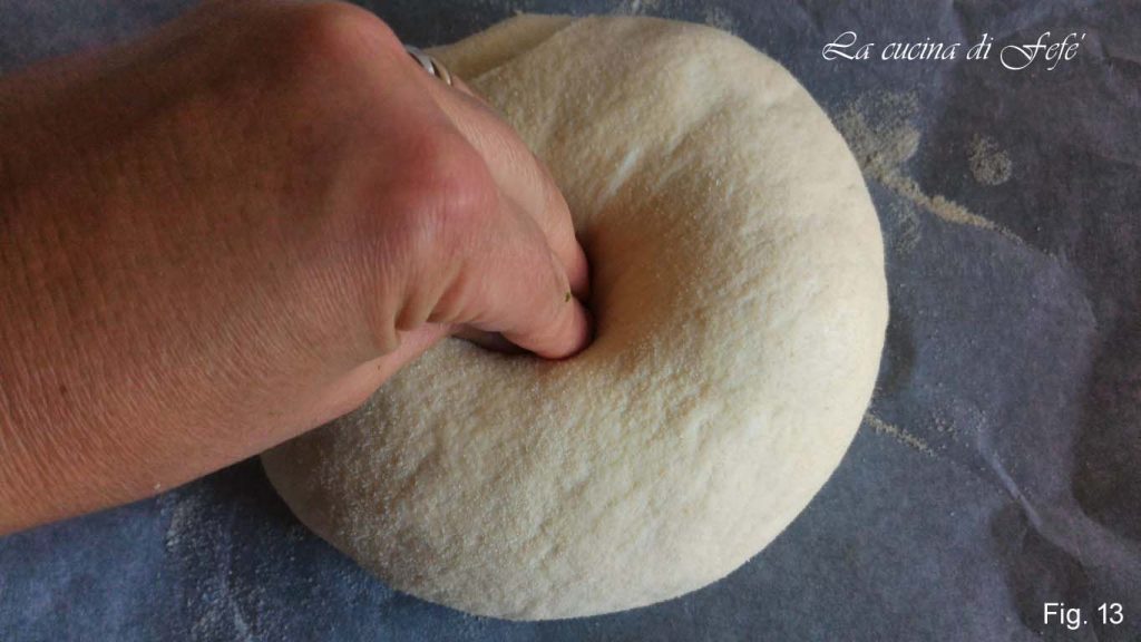 Arredonde a massa e transfira para uma assadeira revestida com papel manteiga ligeiramente enfarinhado. Enfarinhe um pouco também o centro do pão e faça um buraco no centro alargando-o com as mãos, tomando cuidado para não rasgá-lo (fig. 13).