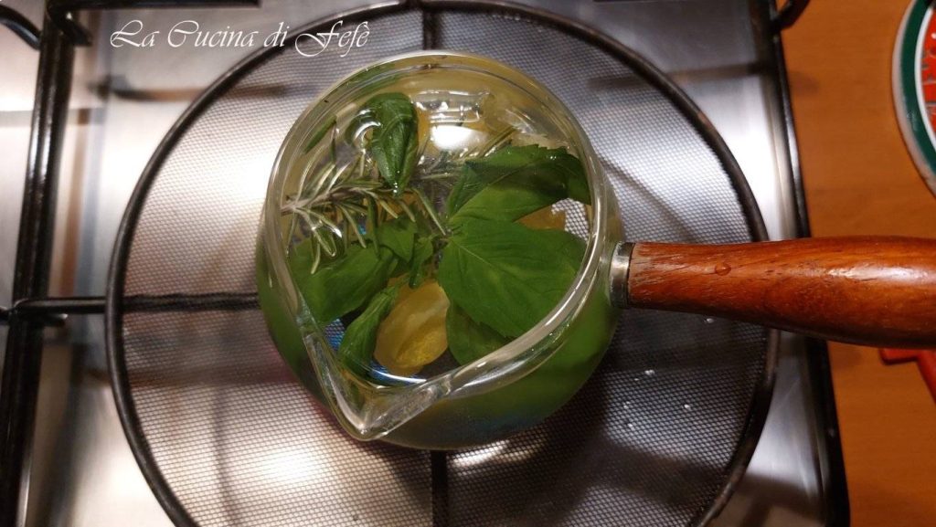 Despeje a água em uma panela, adicione a casca do limão, as folhas de manjericão e o raminho de alecrim e leve tudo a ferver em fogo médio.