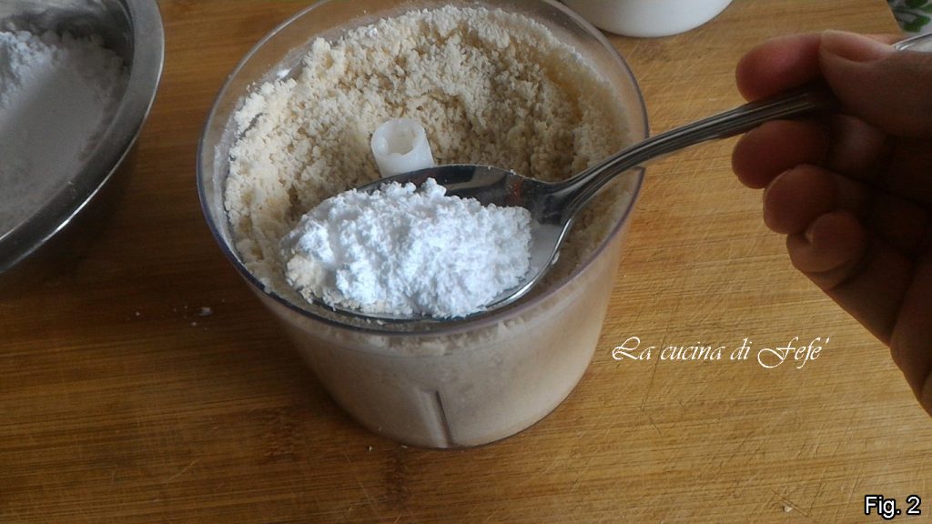 • Triture aos poucos para não aquecer demais as nozes, pois isso liberaria seu óleo, e reduza-as a pó, depois adicione o açúcar de confeiteiro previamente peneirado aos poucos (fig. 2).