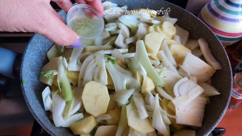 • Adicione primeiro a erva-doce e depois as batatas e deixe apurar por alguns minutos, mexendo com uma colher de pau.