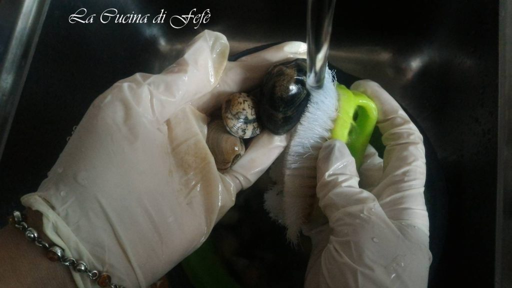 Primeiro, selecione as amêijoas para eliminar as quebradas, depois transfira-as para uma tigela com água fria e sal grosso, mantendo-as em molho por 1 h e trocando a água algumas vezes para que soltem eventuais resíduos de areia. Após esse tempo, enxágue-as em água corrente, escovando-as cuidadosamente com uma escova de cozinha.