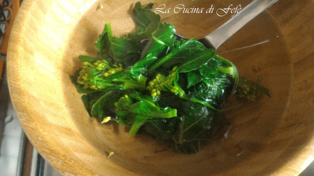 Leve para ferver uma panela com água levemente salgada e cozinhe as flores de brócolis por 5′, depois escorra-as com uma espumadeira, conservando a água do cozimento, e mergulhe-as imediatamente em água fria para que mantenham sua cor brilhante.
