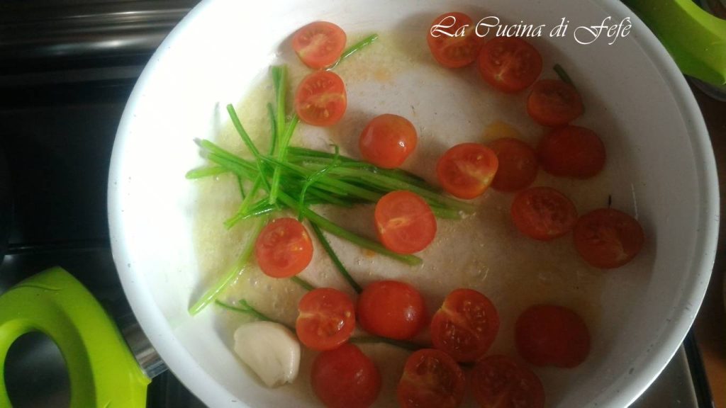 Depois de alguns minutos, adicione os tomatinhos previamente lavados e cortados ao meio.