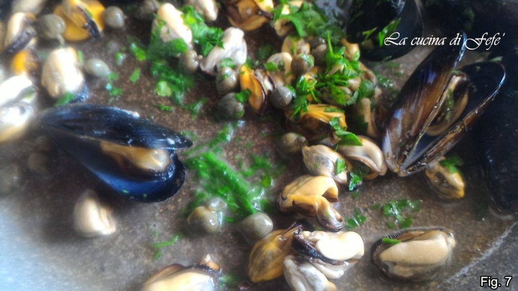 Elimine o alho, deixe apurar por alguns minutos, depois abaixe o fogo, adicione as alcaparras dessalgadas e a salsinha (fig. 7).