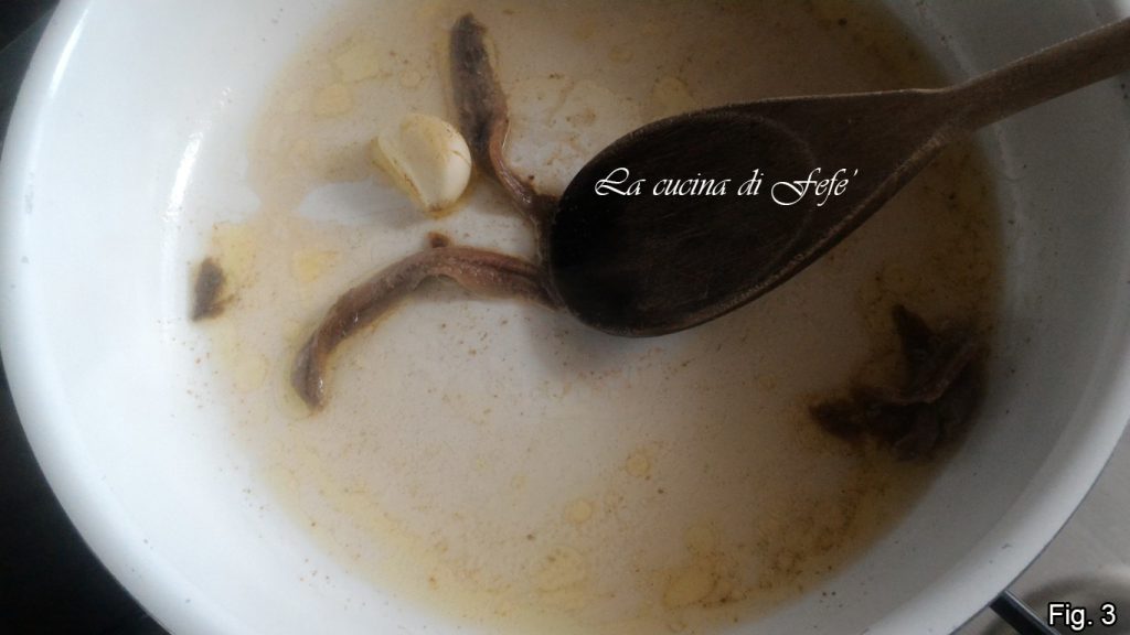 • Em uma frigideira antiaderente, doure o alho com duas colheres de azeite. Junte também as anchovas bem escorridas de seu óleo e deixe temperar por 2 minutos em fogo baixo (fig. 3).