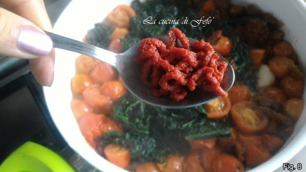 • Adicione a couve escaldada ao molho de tomatinhos e duas conchas do caldo de cozimento (fig. 7).
