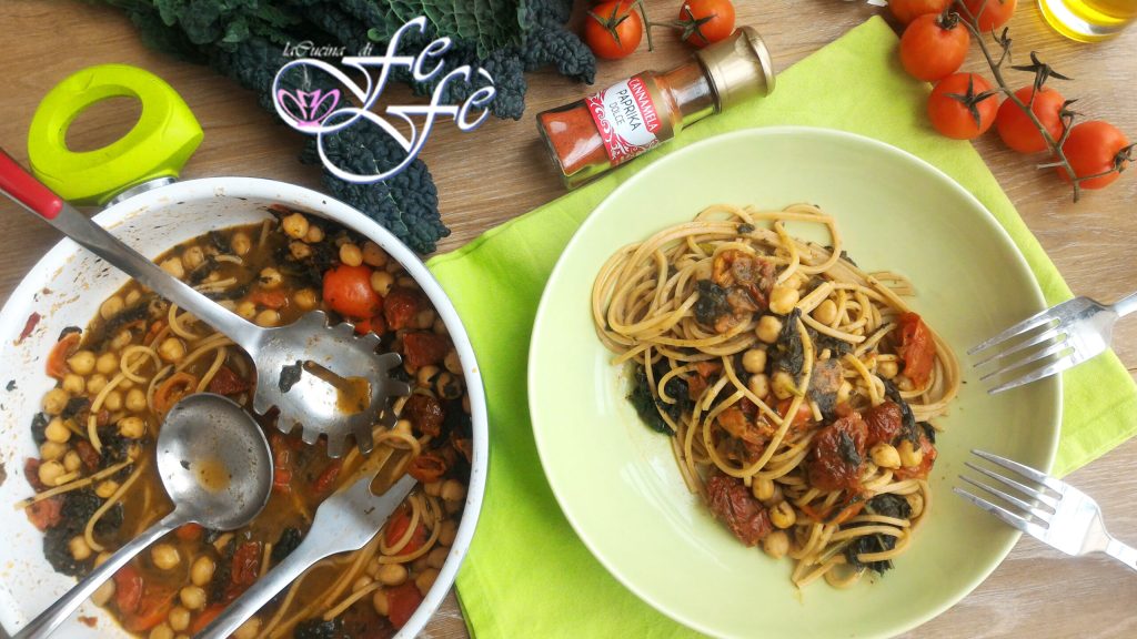 Alguns dias atrás, ao revisar minhas últimas publicações aqui no blog, percebi que fazia tempo que não compartilhava a preparação de um bom prato principal! Apesar disso, sempre me considerei uma verdadeira amante de massas, mas não gosto de ser banal em minhas propostas, porque experimento muito, mas só compartilho o que realmente considero digno de sua atenção! O espaguete que recomendo hoje, por exemplo, pode se orgulhar dessa peculiaridade, aliás, ousaria dizer que são tão deliciosos que os proporia como um prato gourmet. O conceito que quero expressar é que, mesmo com verduras da horta, podemos viver uma verdadeira experiência de degustação. Vamos desmistificar o mito de que pratos feitos apenas com vegetais são tristes e deprimentes e abrir nossa mente para saborear de maneira diferente o que a mãe natureza nos oferece sazonalmente! É apenas uma questão de adicionar um ingrediente especial, mas comum a todas as preparações: a criatividade! Este prato é uma combinação perfeita de sabores, que do inverno, com a couve, abre-se para a primavera, com os primeiros tomatinhos frescos. A esses, adicionei também tomatinhos semisecos que, devo dizer, conferem ao conjunto um toque a mais! E para completar o prato do ponto de vista nutricional, quis combinar leguminosas como o grão-de-bico, que combinam bem com esses e muitos outros ingredientes, graças à sua versatilidade! Um prato realmente saboroso, perfeito para qualquer ocasião em que você queira trazer à mesa algo incomum e, ao mesmo tempo, surpreendente no sabor, com poucos e simples passos!