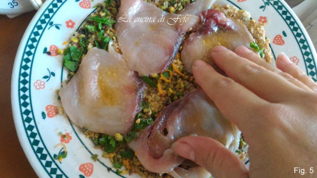 Passado o tempo de marinada, passe as fatias de peixe-espada no empanamento, fazendo com que ele adira bem aos dois lados e deixando cair o excesso.