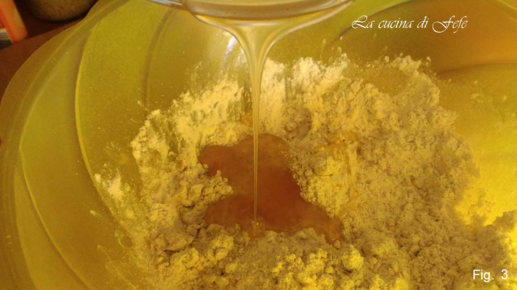Misture e despeje imediatamente o óleo incorporando-o com movimentos das mãos que partem do fundo da tigela e levantam a farinha como uma chuva, esfregando-a (fig. 2).