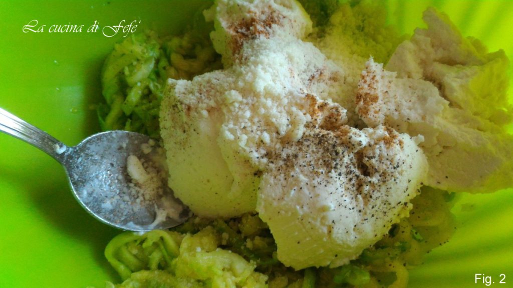 Enquanto isso, em uma tigela, trabalhe a ricota com o pecorino ralado, a noz-moscada, uma pitada de sal e uma moída de pimenta (fig. 2).