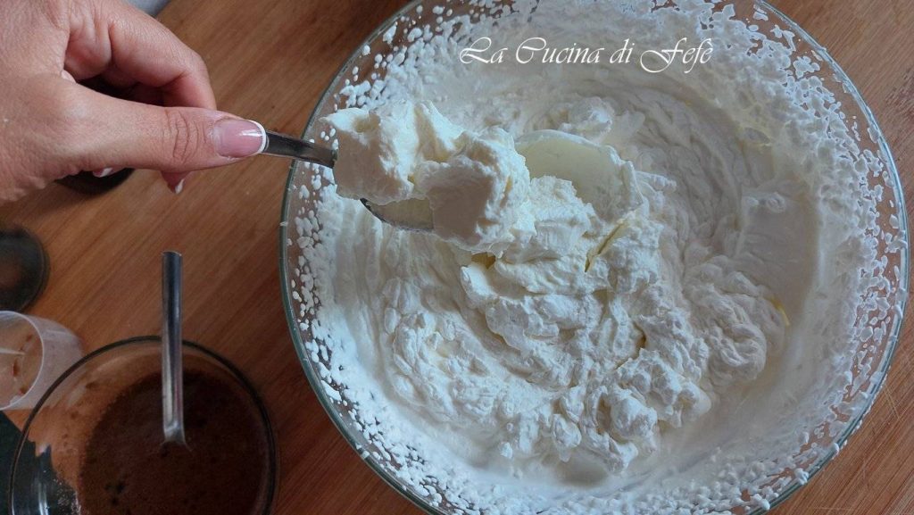 • Enquanto isso, bate o creme de leite fresco em ponto de neve com a batedeira elétrica usando uma terrina grande bem fria da geladeira.