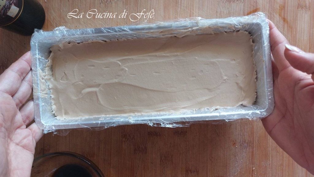 • Após o tempo de descanso no freezer, retire o semifreddo da forma, virando-o delicadamente em uma travessa e remova o filme plástico com o qual está coberto. Coloque temporariamente de volta no freezer.