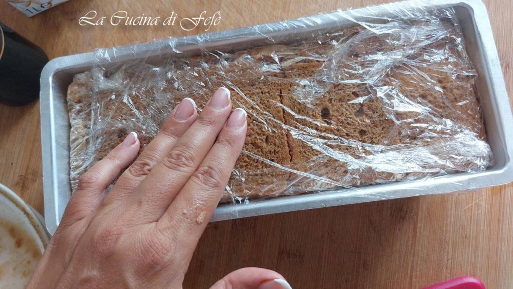 • Transfira a mistura para uma forma de bolo inglês adequada para refrigeração 30×10, umedeça-a ligeiramente com um pouco de água apenas para aderir melhor um filme plástico para alimentos, sem PVC, com o qual você irá forrá-la.
