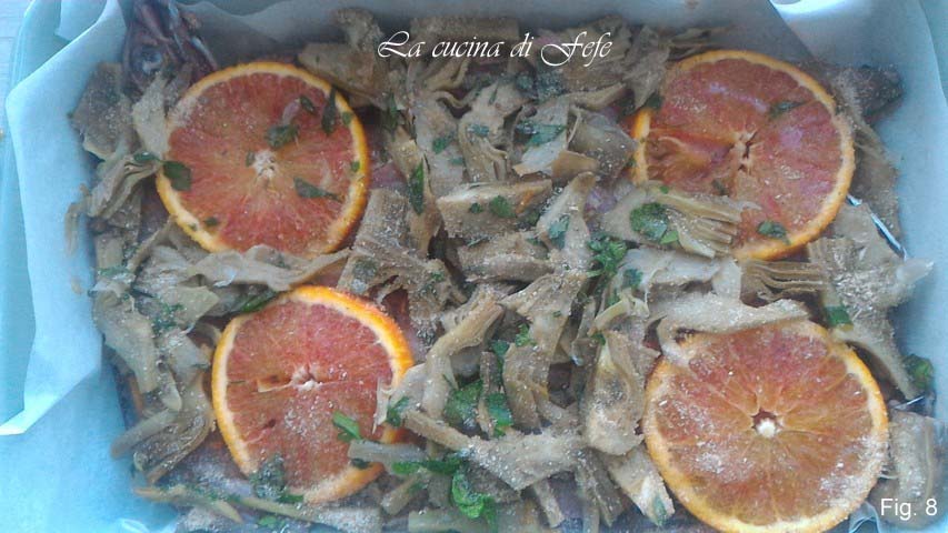 Cubra os filés com as alcachofras refogadas e algumas fatias de laranja. Regue com um fio de azeite e o suco de meia laranja e coloque no forno estático a 180°C por 25′ (fig. 8).