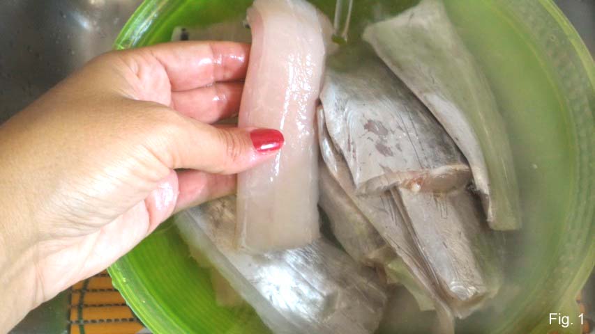 Filete o peixe, divida em pedaços e lave-os em água corrente.