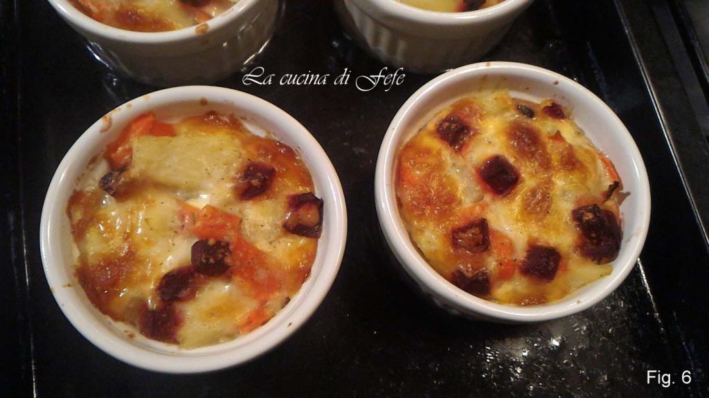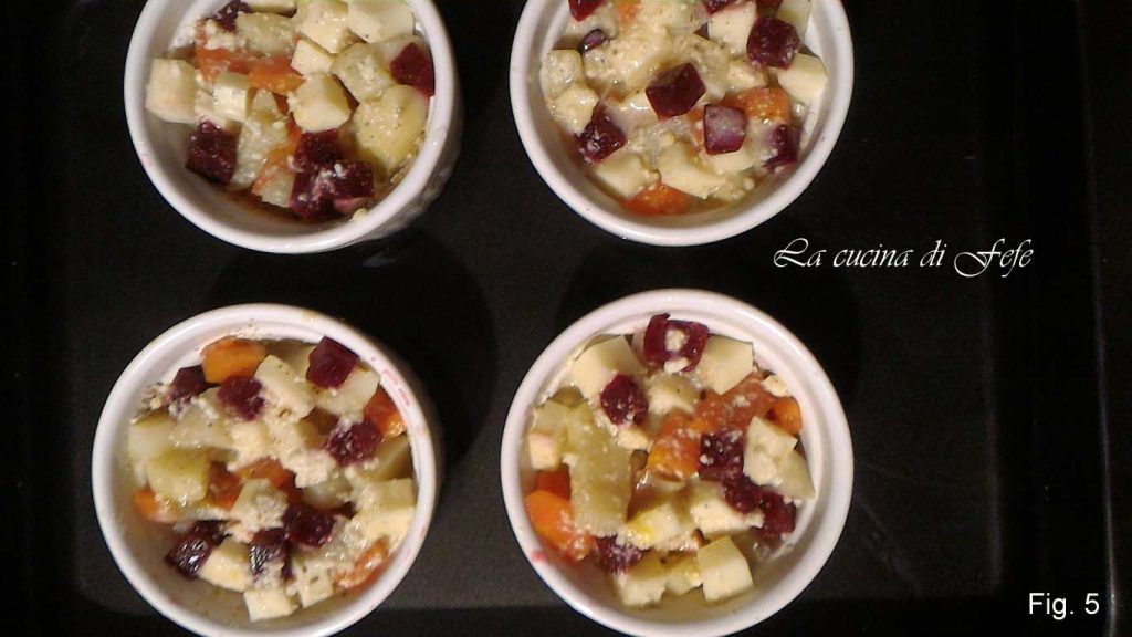 Ferva-as em uma panela com bastante água salgada por 5-6 minutos, escorra e passe-as em água corrente fria. Unte 6 cocottes com manteiga e polvilhe com farinha de rosca. Distribua dentro os cubos de batata e cenoura (fig. 2).