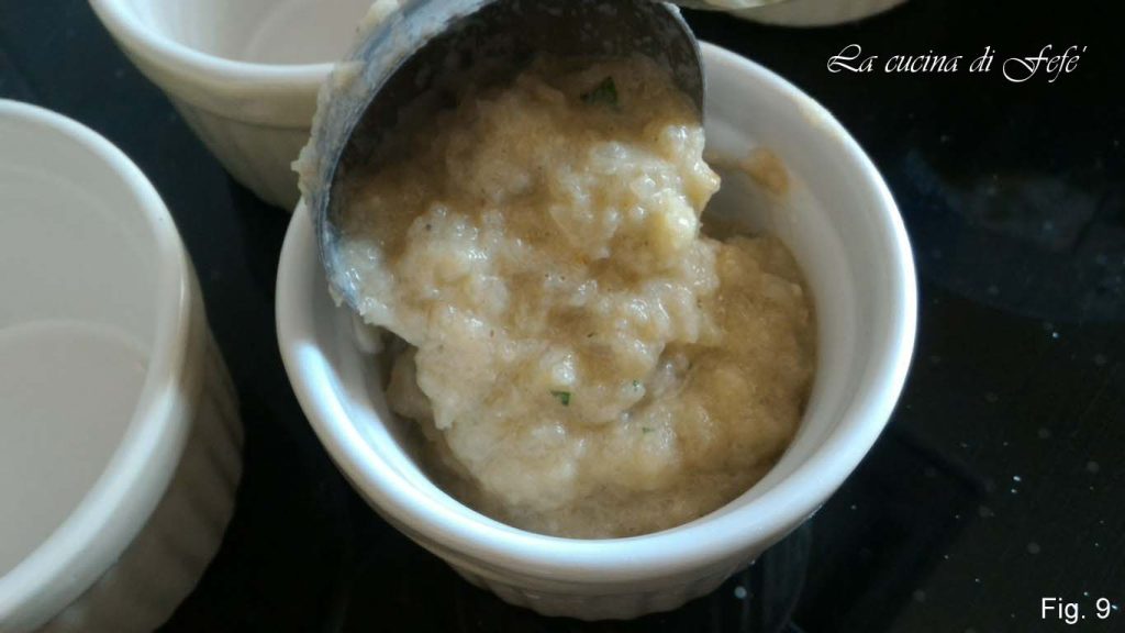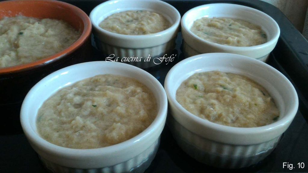 Então prepare as formas de cerâmica ou, se não as tiver, aquelas de alumínio descartáveis, pincele-as com um pouco de manteiga e, com uma concha, despeje a mistura de topinambur e batata em cada forma, deixando meio centímetro da borda (fig. 9).