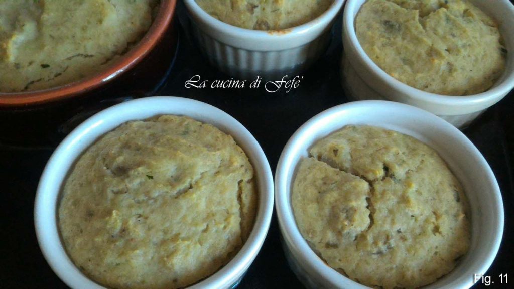 Coloque as formas dentro de uma assadeira que possa contê-las todas de maneira adequada. Encha com água quente, não fervente, até 2/3 da altura delas. Coloque no forno e cozinhe em banho-maria a 180°C por cerca de 40′-45′. Após esse tempo, coloque as formas na grelha do forno e ative o modo grill a 200°C por mais 6′ (fig. 10).
