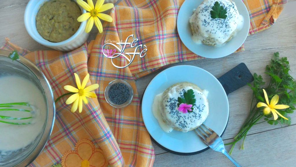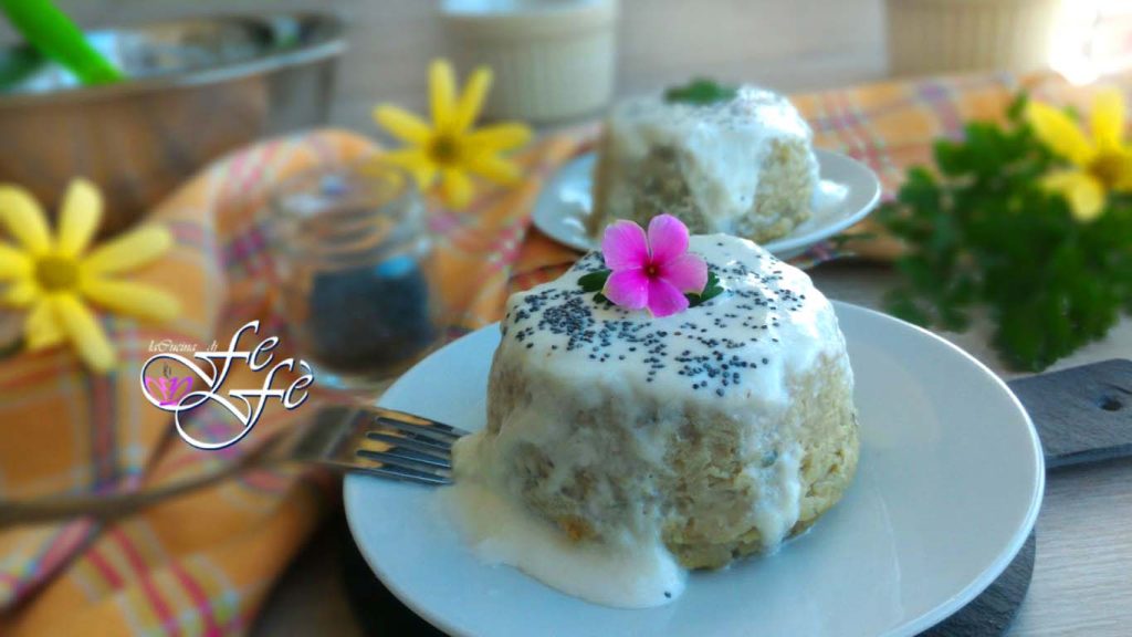 Quando estiverem em temperatura ambiente, desenforme-os ajudando-se com a lâmina de uma faca para soltá-los melhor das formas, mas em teoria, uma vez invertidos, devem deslizar no seu prato sem dificuldade. Enfeite, despejando sobre os flans o creme de stracchino a gosto e decorando com sementes de papoula e mais salsinha.